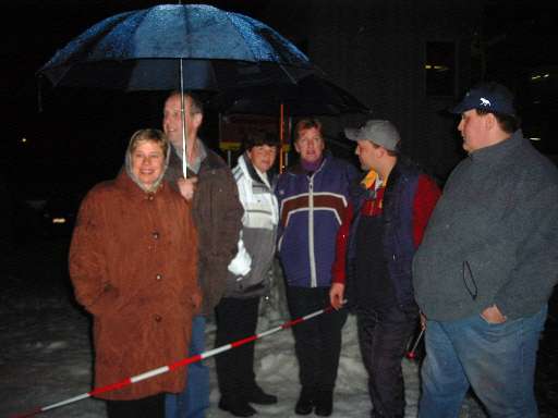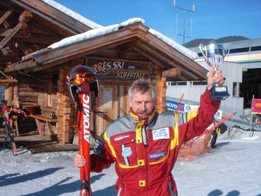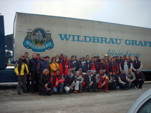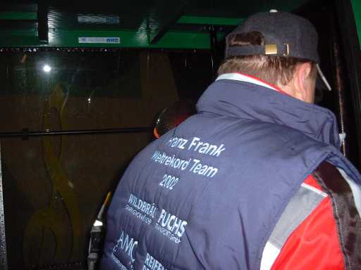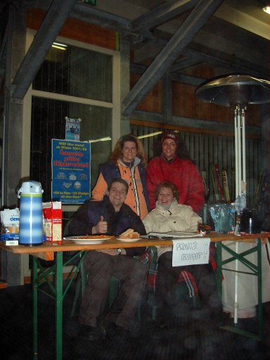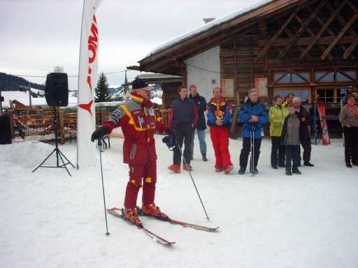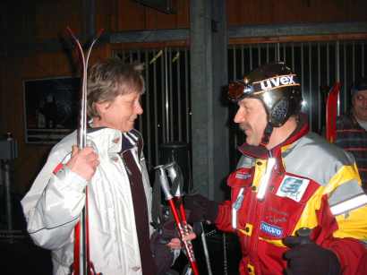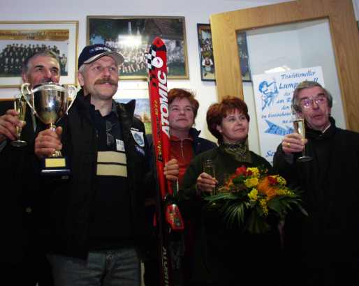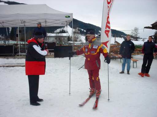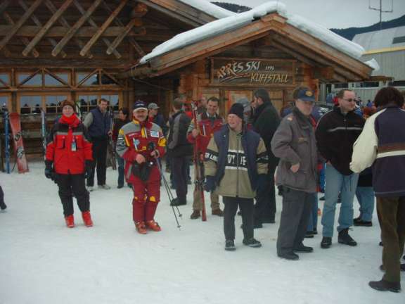 Beste Stimmung vor dem Kuhstall. Aus Bayern kam ein ganzer Bus mit Fans. Franz Franks kleines Heimatdorf Untereichhofen dürfte zur Hälfte entvölkert gewesen sein. Immer wenn der 50jährige am Zielhang erschien, waren Anfeuerungsrufe zu hören. Auch einige Sponsoren schauten vorbei, um sich anzusehen, was mit ihrem Geld auf die Beine gestellt wurde.