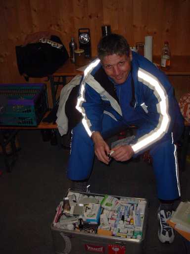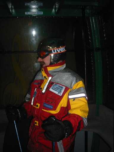 Die ersten 24 Stunden sind geschafft und Franz Frank ist voll fit. Er peilt jetzt die 50 000 Höhenmeter-Grenze an. Die wird er innerhalb einer Stunde erreicht haben. Wegen der kurzen Liftfahrzeiten zwischen Berg- und Mittelstation während der Nacht war auch die Abfahrt kurz. Da hatten die sich abwechselnden Betreuerteams eine Menge zu tun. Dazu regnete es auch noch. Ständig musste feuchte Kleidung ausgewechselt werden. Trotz des Regens hielten es einige Fans die ganze Nacht über aus, um Franz anzufeuern.