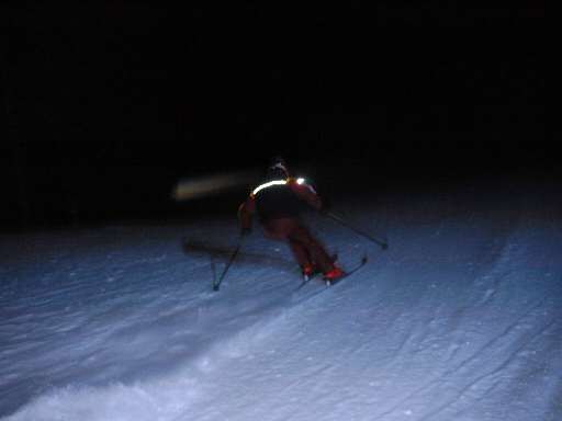 Schock Nummer zwei: Um 2:35 Uhr gehen die Lichter aus. Die Weltrekordstrecke liegt im Dunkeln. Nur die Scheinwerfer an Mittel- und Talstation leuchten noch. Die Teamelektriker Anton Wetterstetter und Werner Stinauer werden aus dem Bett geholt. Franz Frank ist auf der Piste, vermindert das Tempo und kommt in der Talstation an. Er macht kurz Pause, fährt dann aber wieder mit der Gondel bergauf. Begleitfahrer Josef Weiß nimmt einen starken Handscheinwerfer mit. Der High-Tech-Strahler, entwickelt von Teammitglied Martin Meilinger, wird immer beim Ausweichen auf unbeleuchtete Liftanlagen benutzt, wenn beim „Flying Mozart“ zu Betriebsbeginn oder Betriebsende, also jeweils in der Dämmerung, die Gondeln umgehängt werden. Damit kann Franz Frank die Strecke auch ohne die Flutlichtanlage benutzen, wenn auch etwas eingeschränkt.