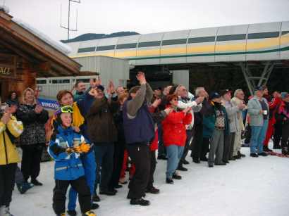 „La Ola“-Welle an der Talstation. Franz Frank hat soeben seinen eigenen Rekord vom vergangenen Jahr eingestellt: 101 Stunden, 15 Minuten auf dem Ski. Auch die Höhenmetermarke 2001 wurde inzwischen übertroffen. Gefeiert wird jedoch noch nicht. Denn noch liegen rund 29 Stunden vor dem 50jährigen bis zur neuen Marke von 130 Stunden.