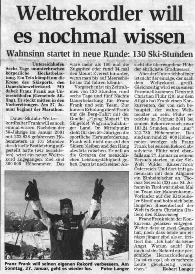 Am 27. Januar 2002 um 10:00 Uhr an der Talstation "Flying Mozart" in Wagrain wird Franz Frank wieder einen neuen Weltrekordversuch im Langzeitskifahren mit den meist gefahrenen Höhenmetern starten.