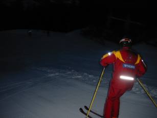 Obwohl ihre 4-Stunden-Schicht abgelaufen ist, sind einige der Begleitfahrer weiter auf der Strecke unterwegs. Die pure Lust am Skifahren, an den hohen Geschwindigkeiten, die Leidenschaft für den Sport, die auch Franz Frank antreibt.