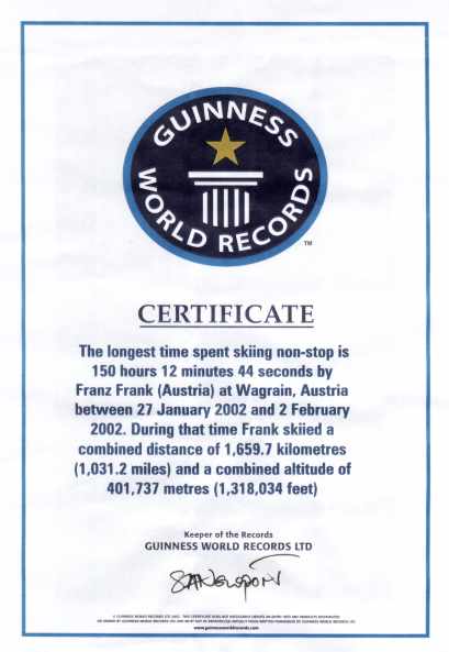 Acht Monate hat es gedauert bis die Urkunde von Guinness kam, nun ist es quasi amtlich. Franz Frank (50) aus Untereichhofen bei Aßling (Landkreis Ebersberg, Bayern) hat den Weltrekord im Dauerskifahren, bestätigt durch den Guinness Verlag. Zwischen dem 27. Januar und dem 2. Februar dieses Jahres stand der geborene Steiermärker Tag und Nacht in Wagrain (Salzburger Land, Österreich) auf den Brettern, insgesamt 150 Stunden, zwölf Minuten und 44 Sekunden. Frank legte dabei 1659,7 Kilometer zurück, die Strecke von München nach Berlin und wieder zurück. Der sportliche Wert liegt auch in den Höhenmetern. Insgesamt 401 737 Meter wurden überwunden. "Unruhig wurde ich nicht, weil es so lange mit der Bestätigung gedauert hat", so Frank. "Ich weiß ja was ich geleistet habe." Der Eintrag ins Guinessbuch 2003 hat leider nicht mehr geklappt, dies hat aber lediglich redaktionelle Gründe, so der Guinness Verlag im Begleitschreiben der Urkunde. Der Weltrekord wurde durch eine ganze Reihe von Juroren überprüft, darunter auch Wagrains Bürgermeister Eugen Grader und der örtliche Notar. Die Betreuer lösten sich nach Vorgaben des Guinness Verlages im Vier-Stunde-Rhythmus ab. Der Rekord wurde in Zeitlisten eingetragen, jede Abfahrt, jede Liftfahrt wurde gestoppt und notiert. Zusätzlich gab es weitere Kontrollen. Franz Frank trug auch ein Messgerät am Körper. "Ohne mein Team hätte ich das nicht geschafft", betont Frank. Rund 40 Betreuer, darunter drei Ärzte, kümmerten sich um den Spitzensportler. "Dass das jemand nachmachen kann, glaube ich nicht", so Frank. Zeitgleich mit ihm waren zu Beginn des Jahres zwei weitere Rekord-Bewerber in Tirol gestartet, Christian Flühr (28) aus dem Allgäu und Thomas Seiwald (31, St. Johann, Tirol). Sie hatten jedoch nach 130 Stunden aufgehört. Frank fürchtet die Konkurrenten nicht, die für kommendes Jahr einen neuen Versuch angekündigt haben. "Die sollen es erst einmal versuchen", meint der Weltrekordler. Weitere Aktionen schließt der 50-Jährige nicht aus. "Vielleicht 2003", meint er verschmitzt.